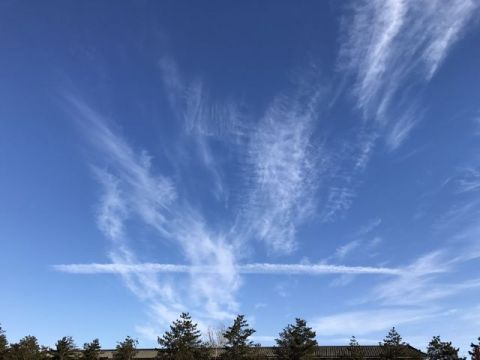 阳光明媚的天气,抬头望向蓝天,形态各异的白云就是美丽的景色。飞机掠过高空,排出的燃料燃烧废气中含有大量水蒸汽,在高空中遇冷凝结成大颗粒水滴或冷凝成冰晶,形成凝结云。与天空中的没有规则的白云结合在一起,就是一幅美丽的画!