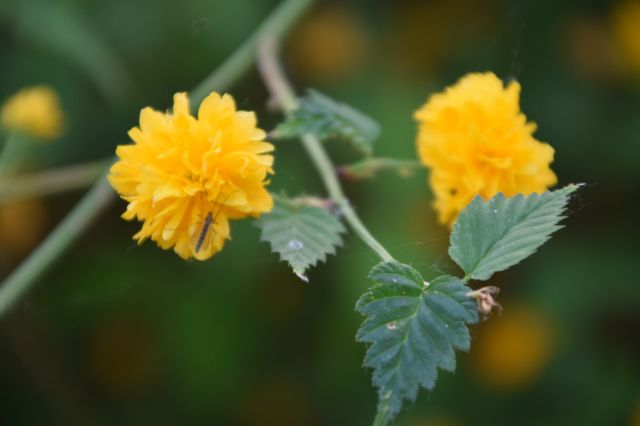 棣棠花 灌木,高1-2米;小枝有棱,绿色,无毛。叶卵形或三角形,先端渐尖,基部截形或近圆形,边缘有重锯齿,花直么3-5厘米;萼筒扁平,裂片5,卵形,全缘,无毛;花瓣黄色,宽椭圆形;雄蕊多数,离生,长约花瓣之半;心皮5-8,有柔毛,花柱约与雄蕊等长。