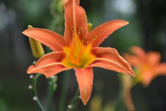 萱草别名众多,有“金针”、“黄花菜”、“忘忧草”、“宜男草”、“疗愁”、“鹿箭”等名,英文中称萱草为“虎百合”,花色橙黄、花柄很长、呈为像百合花一样的筒状。结出来的果子有翅。
